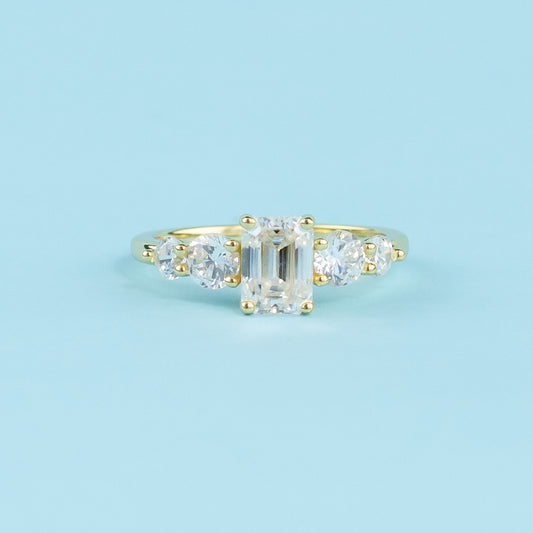 Eternal Brilliance Five-Stone Emerald Cut Moissanite Engagement Ring Set in 9ct Yellow Gold