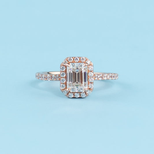 Forever Classic Halo Emerald Cut Moissanite Engagement Ring Set in 9ct Rose Gold