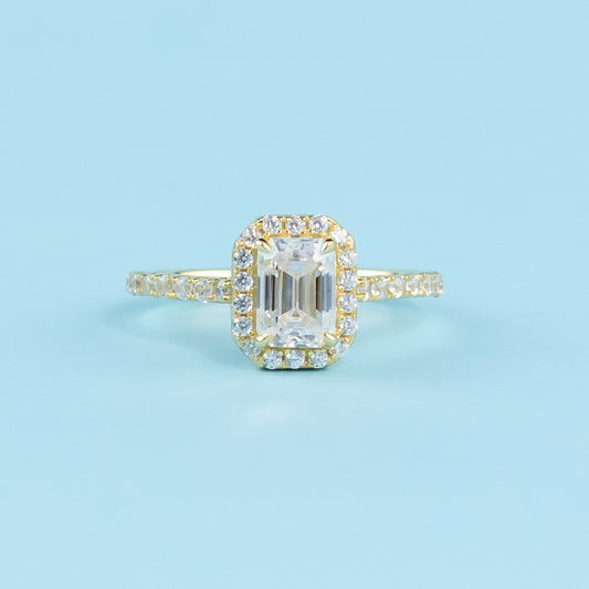 Forever Classic Halo Emerald Cut Moissanite Engagement Ring Set in 9ct Yellow Gold