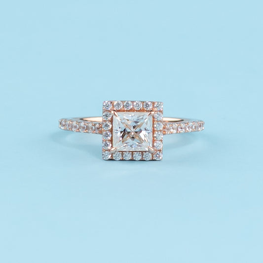 Forever Classic Halo Princess Cut Moissanite Engagement Ring Set in 9ct Rose Gold