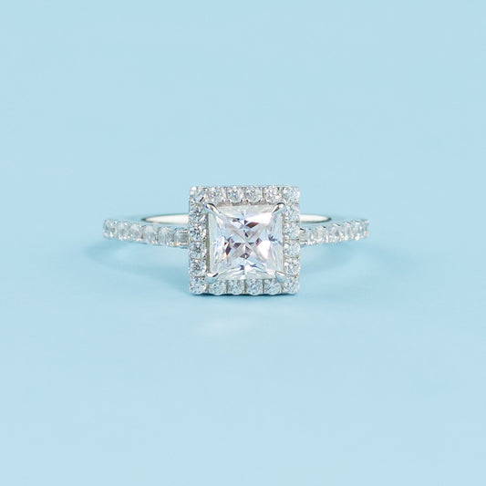 Forever Classic Halo Princess Cut Moissanite Engagement Ring Set in 9ct White Gold