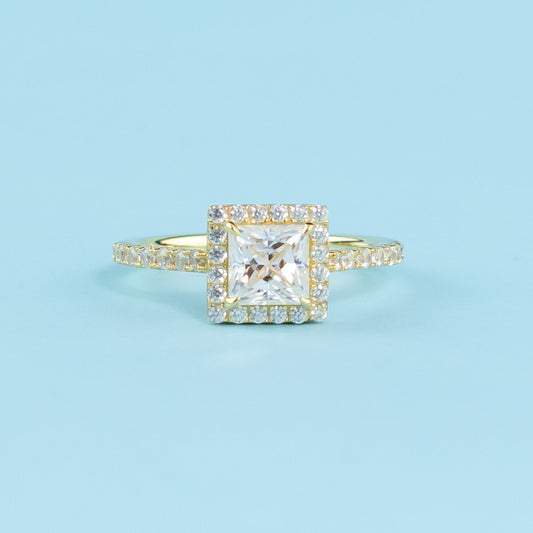 Forever Classic Halo Princess Cut Moissanite Engagement Ring Set in 9ct Yellow Gold