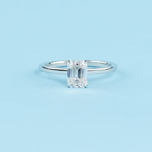 Secret Sparkle Hidden Halo Emerald Cut Moissanite Engagement Ring Set in 9ct White Gold