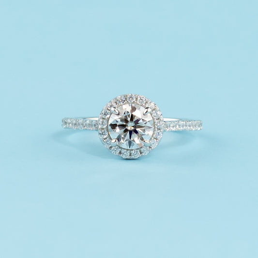 Forever Classic Halo Round Brilliant Moissanite Engagement Ring Set in 9ct White Gold