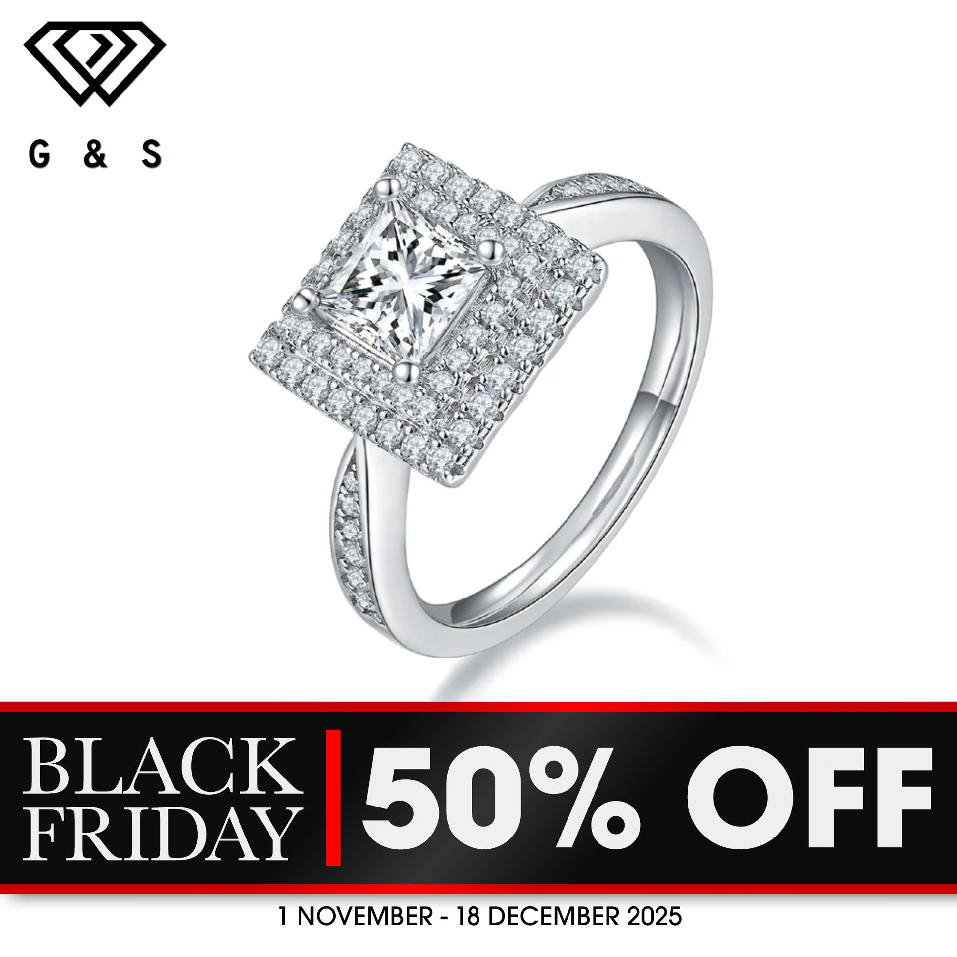 Double Halo 1.00ct Princess Cut Moissanite Engagement Ring - BLACKFRIDAY