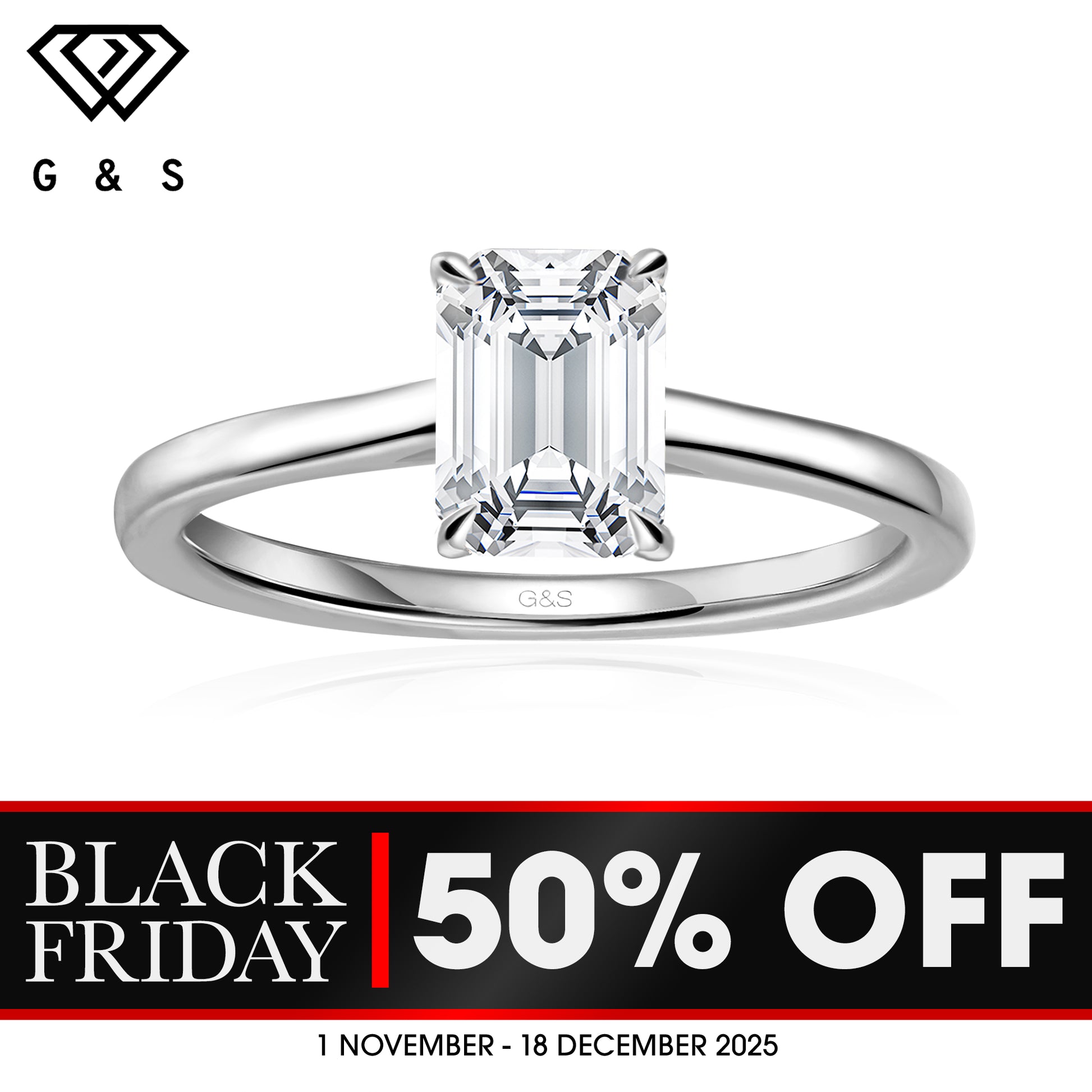- Center Moissanite: Emerald Cut 1.00ct (7mm x 5mm)